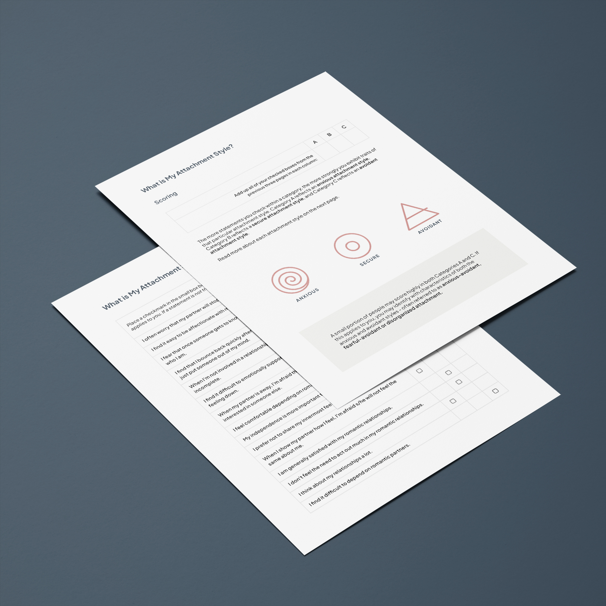 A fluff-free six-page PDF containing the attachment styles test, scoring page and summary of each attachment style.